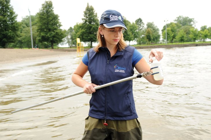 A staff member at Ottawa Public Health takes a sample of the water at a beach in the city. Photo courtesy of Ottawa Public Health.